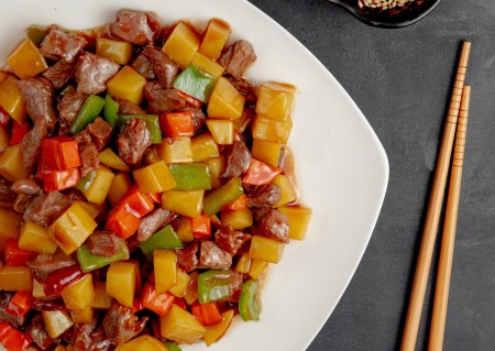 Sautéed with tomatoes, carrots, bell peppers, onions, pineapple and sweet & sour sauce.